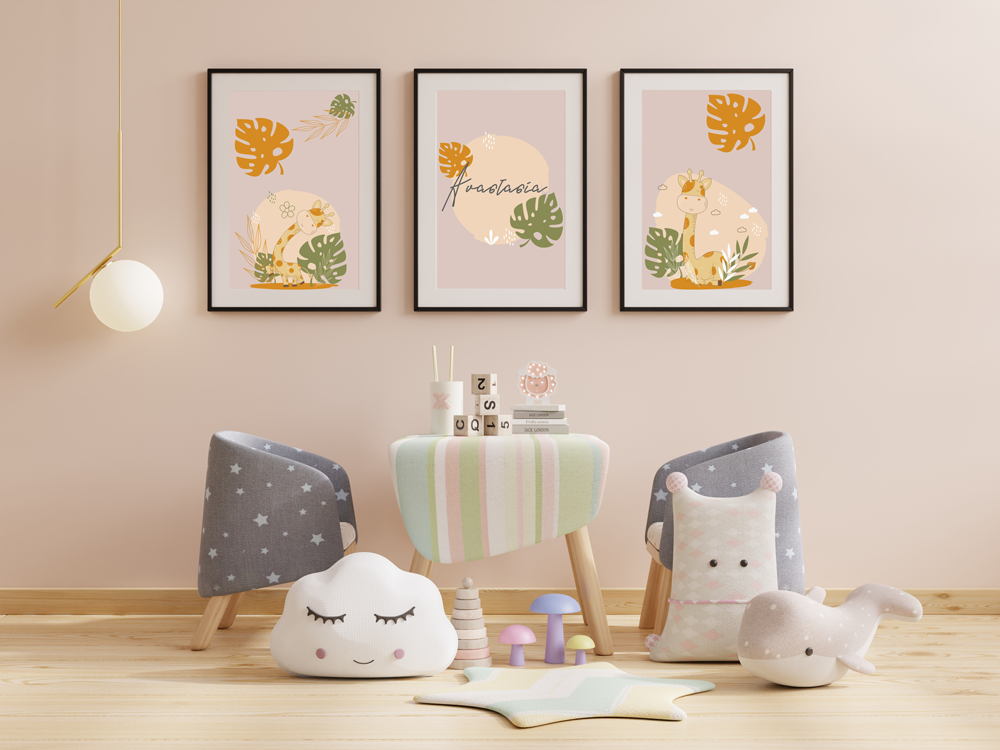 Προσωποποιημένο τρίπτυχο Poster για το παιδικό δωμάτιο με θέμα Καμηλοπάρδαλη και το όνομα του παιδιού σας.